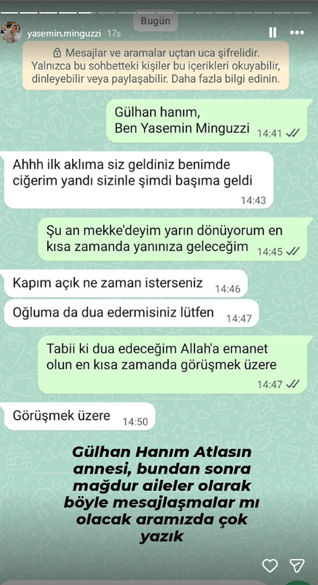 Ahmet Minguzzi'nin annesi Yasemin Minguzzi de Atlas'ın annesinin acısını paylaştı. Sosyal medya hesabından görüşmelerini yayınlayan Minguzzi, “Gülhan Hanım Atlas'ın annesi, bundan sonra mağdur aileler olarak böyle mesajlaşmalar mı olacak aramızda. Çok yazık.” dedi.