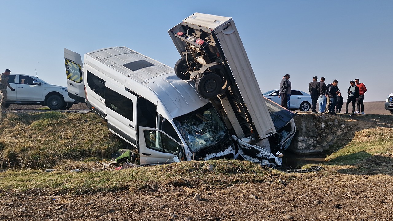 Diyarbakır'da kamyonet, otomobil ve öğretmenleri taşıyan servis minibüsünün çarpıştığı kazada, 15’i öğretmen 17 kişi yaralandı.