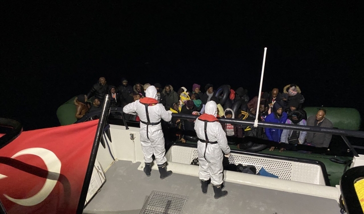 Bölgeye giden TCSG-905 Sahil Güvenlik botu, hareket halindeki durdurdukları lastik bot içinde 54 kaçak göçmen yakaladı.
