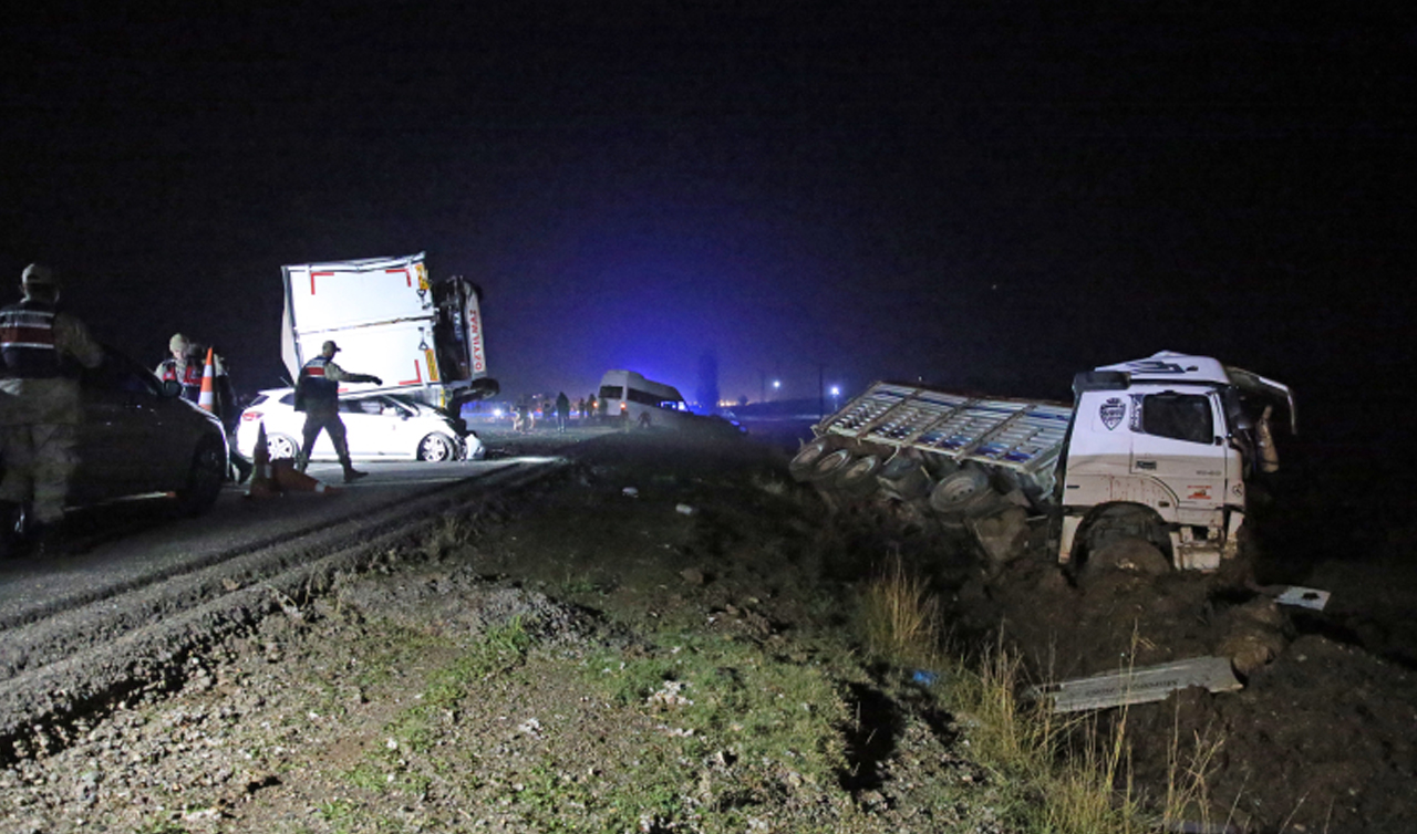 İlçenin kırsal Başaklı Mahallesi mevkisinde, sürücülerinin kimlikleri ve plakaları henüz öğrenilemeyen 2 otomobil, minibüs, kamyonet ve tırın karıştığı zincirleme trafik kazası meydana geldi. Kazada tır, çarpışmanın etkisiyle şarampole devrildi.