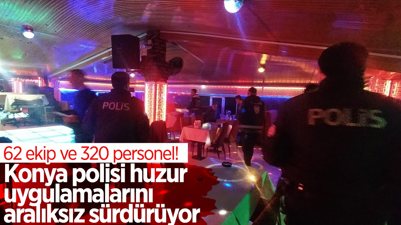 Konya Emniyet Müdürlüğü ekipleri huzur uygulamalarına devam ediyor. Emniyet güçleri 62 ekip ve 320 personelle bu kapsamda yürüttüğü çalışmalarda kentin çeşitli yerlerinde bulunan onlarca eğlence mekanında denetlemelerde bulundu.