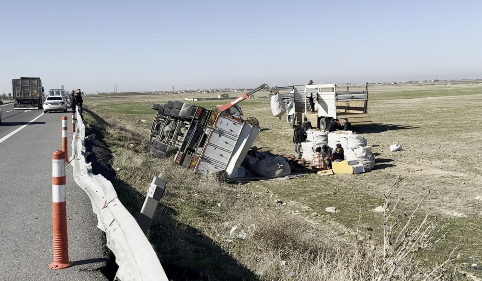Polis ekipleri yolda güvenlik önlemi alırken, yaralı sürücünün sağlık durumunun iyi olduğu öğrenildi. Dökülen patatesler ise sürücünün yakınları tarafından toplanarak başka bir kamyona yüklendi.