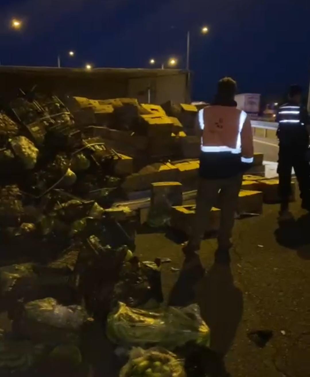 Kaza sonrası devrilen tırdaki sebze dolu koliler yola saçıldı. (Ertan Özkök)
