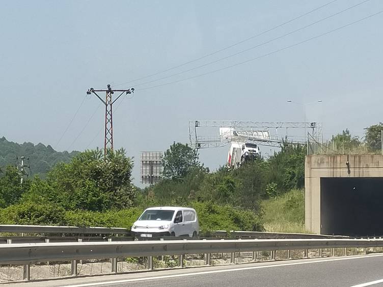Anadolu Otoyolu'nun Düzce kesiminde kamyonun açık kalan damperi, otoyol uyarı levhasına çarptı.