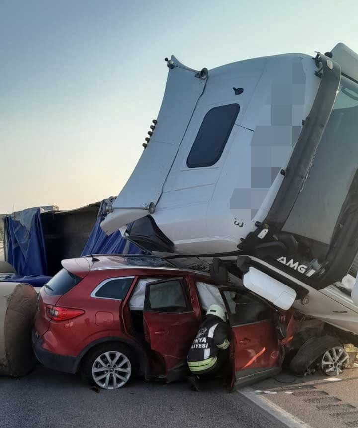 Konya'nın Cihanbeyli ilçesinde TIR'ın otomobilin üzerine devrilmesi sonucu meydana gelen kazada 2 kişi yaralandı.