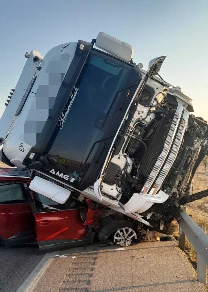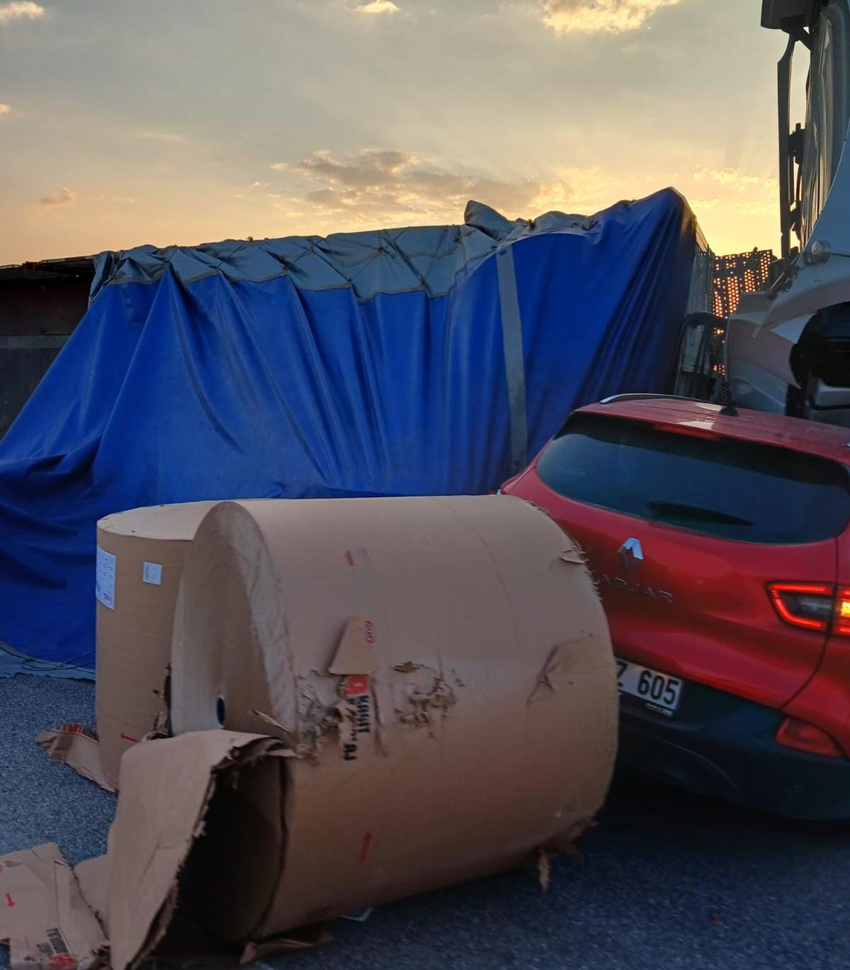 Çarpmanın etkisiyle TIR, karşı şerite geçerek seyir halinde olan ve sürücüsü öğrenilemeyen otomobilin üzerine devrildi. Kazada otomobildeki 2 kişi yaralandı.
