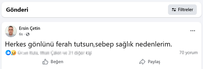 Evli ve 2 çocuk babası Ersin Çetin’in, olaydan kısa süre önce sanal medya hesabından ‘Herkes gönlünü ferah tutsun, sebep sağlık nedenlerim’ yazılı paylaşım yaptığı öğrenildi. Olayla ilgili başlatılan soruşturma sürüyor.