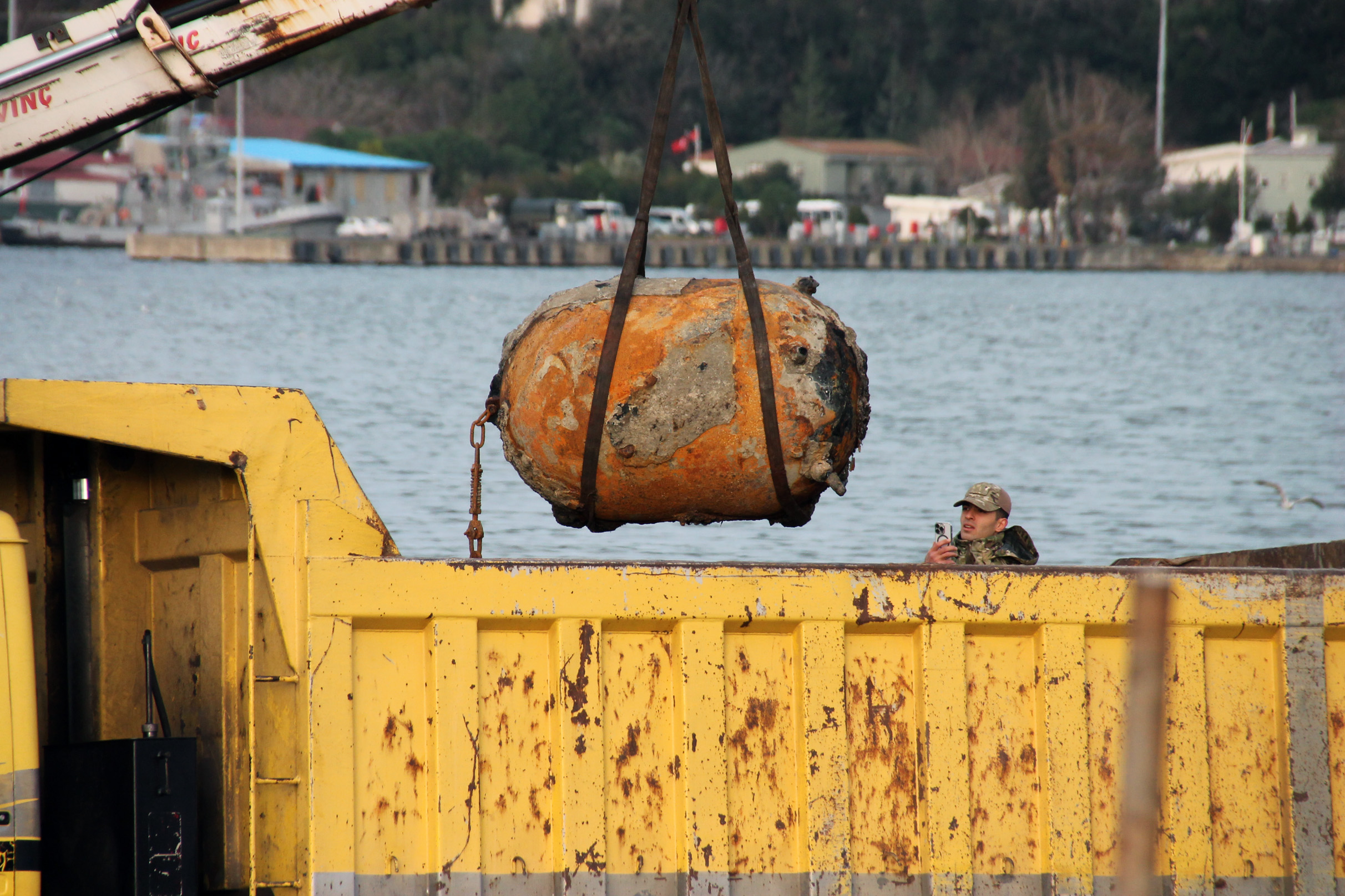 Çekici vasıtasıyla İl Özel İdaresine ait kamyona yüklenen deniz mayını, incelenmek ve imha edilmek üzerine ilçeye bağlı Dağlar Mahallesi'ndeki boş araziye götürüldü.