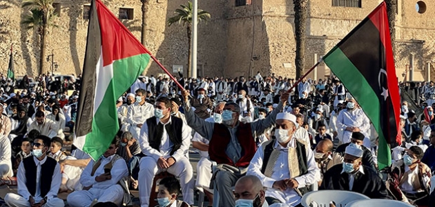 Meydandaki kalabalık, namaz ve hutbenin ardından, ellerinde Libya ve Filistin bayraklarıyla İsrail saldırılarını protesto etti.