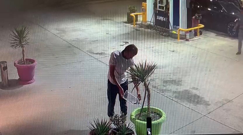 Görüntülerde, 03 HK 184 plakalı aracıyla gelen şüphelinin, aldığı 2 tane 5 litrelik pet şişedeki suyu, akaryakıt istasyonunun marketinin önünde duran saksılara döktüğü, ardından da benzin doldurup ayrıldığı görüldü.