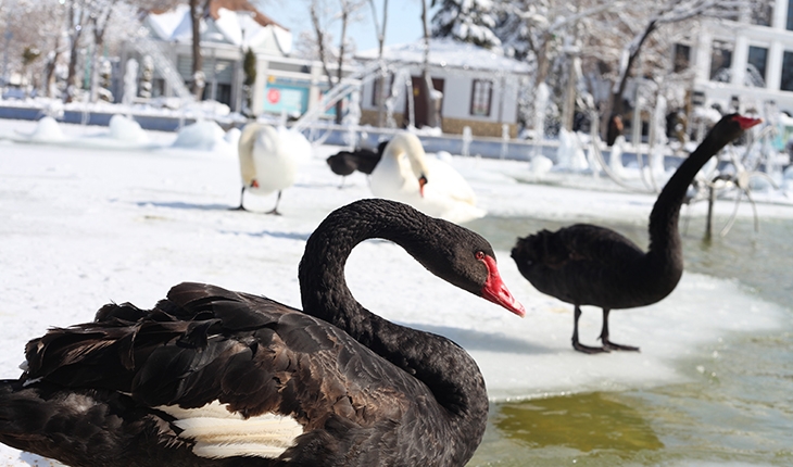 Konya’da etkili olan kar yağışıyla birlikte bazı süs havuzları buz tuttu. Kar yağışının ardından kent merkezinde güneş açarken, Kültürpark'ta bulunan süs havuzundaki siyah kuğuların buz kütleleri üzerinde yürümeleri renkli görüntüler oluşturdu, vatandaşlar ise cep telefonlarıyla fotoğraf çekti.