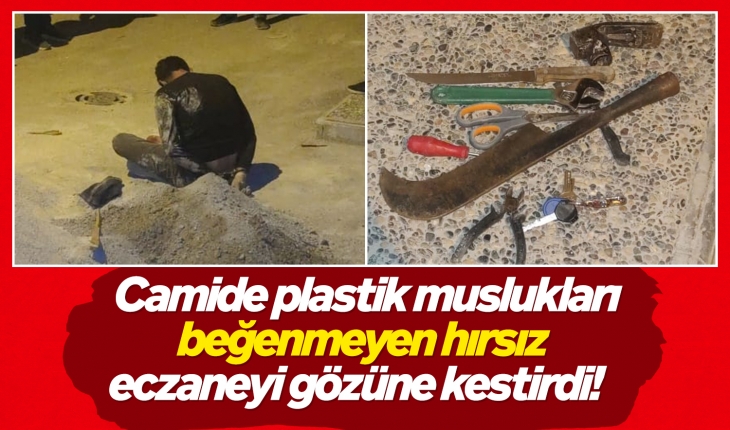 Muslukların plastik olduğunu gören Erkan Y., camii yanında bulunan eczaneye girmek istedi. Ayağının altına taş bırakarak iş yerinin güvenlik kameralarını etkisiz hale getiren hırsız, yanında getirdiği makas, keser ve İngiliz anahtarı ile eczanenin kepenklerini kırmaya başladı.