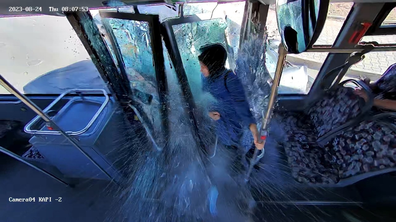 Görüntülerde, durağa koşarak gelen kadın yolcunun bindiği otobüsün orta kapısına, kavşakta cipin çarpması, kadının savrulması, sürücünün otobüsü durdurarak, yolcuların acilen inmesini istemesi, kadının ayağının kırıldığını ve hareket edemediğini söylediği anlar yer aldı.