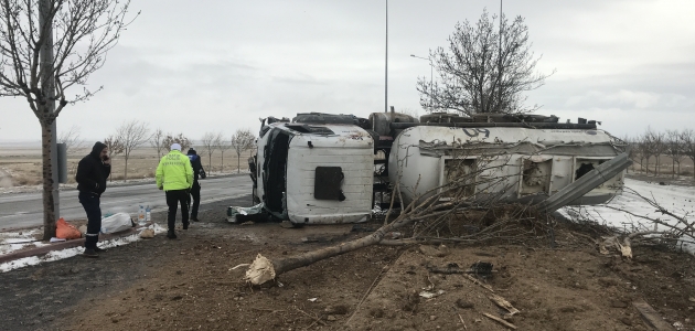 Konya’da kayganlaşan yolda devrilen tankerden tonlarca çamaşır suyu yola aktı.