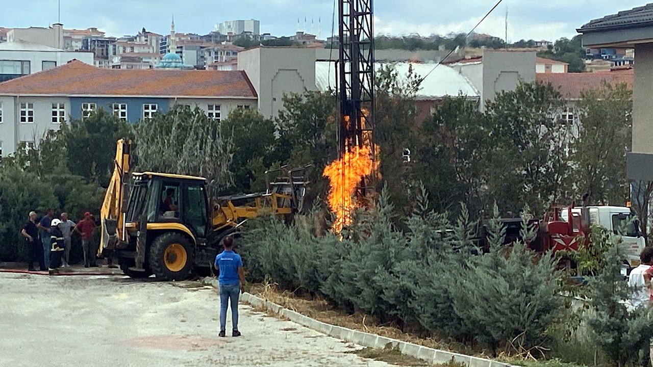 Tekirdağ'da su kuyusu açma çalışmasında sondaj makinesi doğal gaz borusunu patlattı. Gaz alev alırken, itfaiyeciler yangını suyla kontrol alınamayınca üzerine kum dökerek söndürdü.