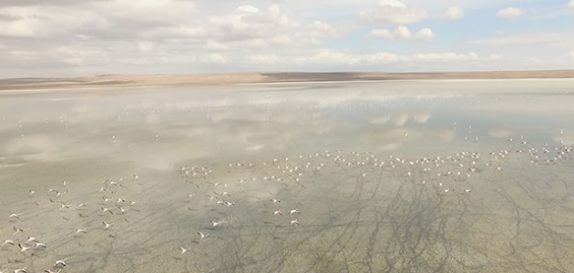 Kon Tv Kulu Muhabiri tarafından flamingoların göl üzerindeki uçuşları ve su üzerindeki yürüyüşleri havadan görüntülendi.