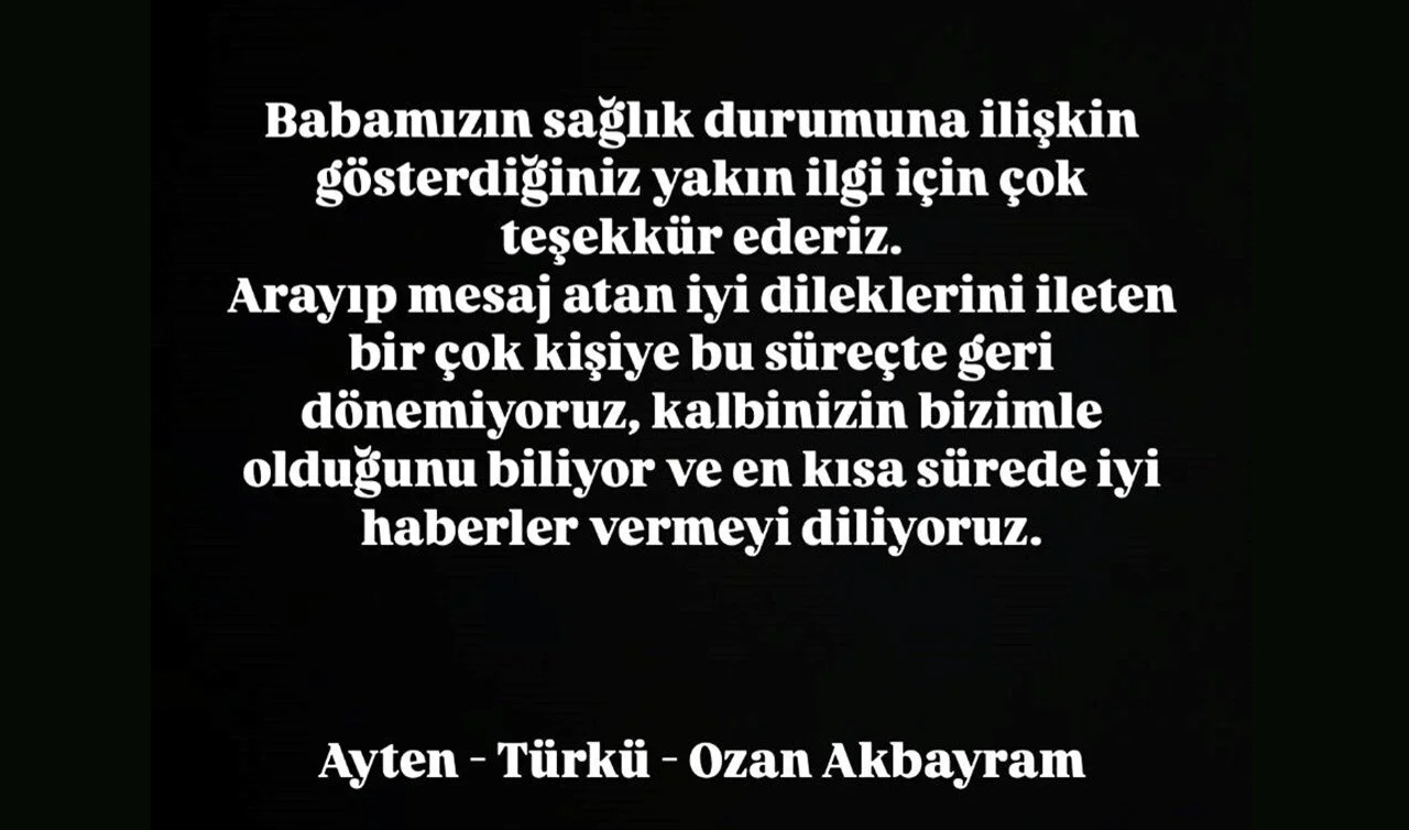 Türkü Akbayram, sosyal medya hesabından ''Babamızın sağlık durumuna ilişkin gösterdiğiniz yakın ilgi için çok teşekkür ederiz. Arayıp mesaj atan iyi dileklerini ileten birçok kişiye bu süreçte geri dönemiyoruz, kalbinizin bizimle olduğunu biliyor ve en kısa sürede iyi haberler vermeyi diliyoruz.'' mesajını paylaştı.
