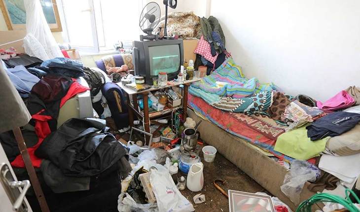 Ekipler, evin odalarında uzun süredir bekleyen çürümüş gıda maddeleri, giysiler, pet şişeler, teneke kutuları, poşet ve kağıtlardan oluşan çöpleri toplayıp kamyona yükledi.