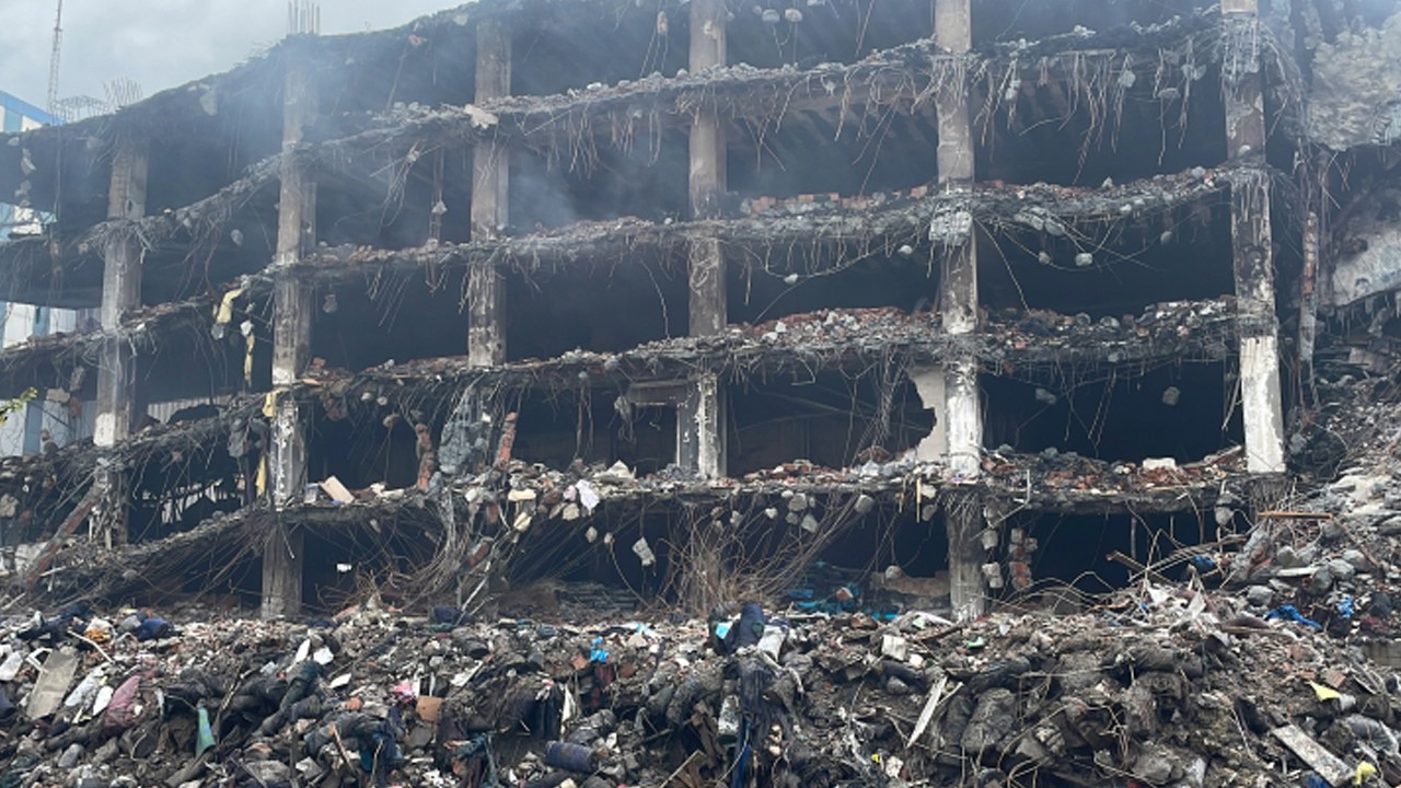 Binanın caddeye bakan bölümünde iş makineleriyle en üst kattan zemine kadar devam eden yıkım çalışmaları tamamlandı. Moloz yığınlarının binanın ön tarafında büyük yer kapladığı görüldü.Binanın bazı katlarından ise hala dumanlar yükseliyor.