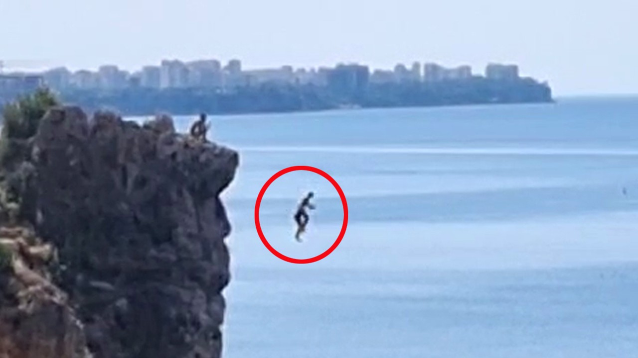 Antalya'da 2 gencin yaklaşık 25 metre yüksekliğindeki falezlerden el ele tutuşarak denize yaptığı tehlikeli atlayış, cep telefonu kamerasıyla görüntülendi.