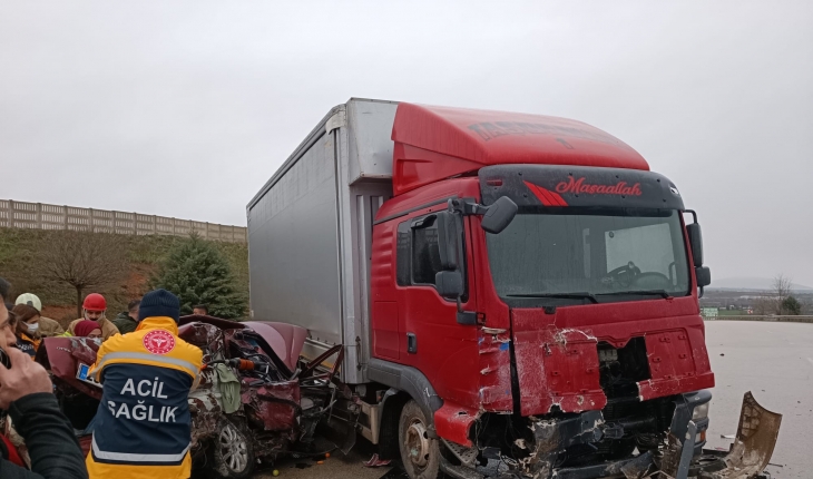 Şuayip Giren (25) yönetimindeki 26 KD 523 plakalı otomobil, Çanakkale-Bursa karayolunun Tophisar mevkiinde karşı yöndeki kavşakta duran ve dönmeyi bekleyen İsmail A. idaresindeki 55 AGY 266 plakalı kamyona çarptı.Kazada, otomobildeki sürücü ile diğer 5 kişi araçta sıkıştı.