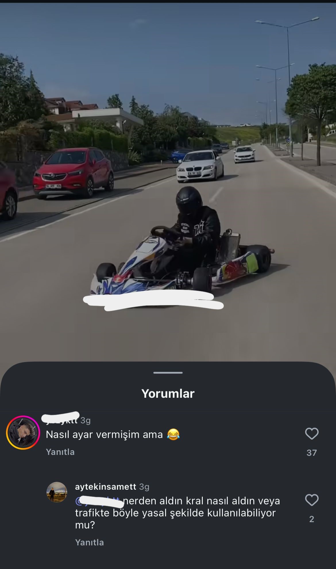 Dakikalarca ilerleyen sürücü ve arkadaşları o anları kayda alıp sosyal medya hesaplarında paylaştı. Sürücü ise kendi kişisel hesabından yaptığı paylaşımda 'eğer go kartınız varsa, hayat o kadar da sıkıcı değildir' ifadelerini kullandı.
