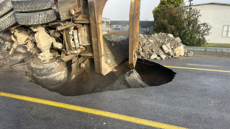 Balıkesir'in Edremit ilçesinde hafriyat kamyonu adeta yarılan yolun içine düştü. Sürücü olaydan yara almadan kurtulurken ekipler yolun tek şeridini trafiğe kapattı.