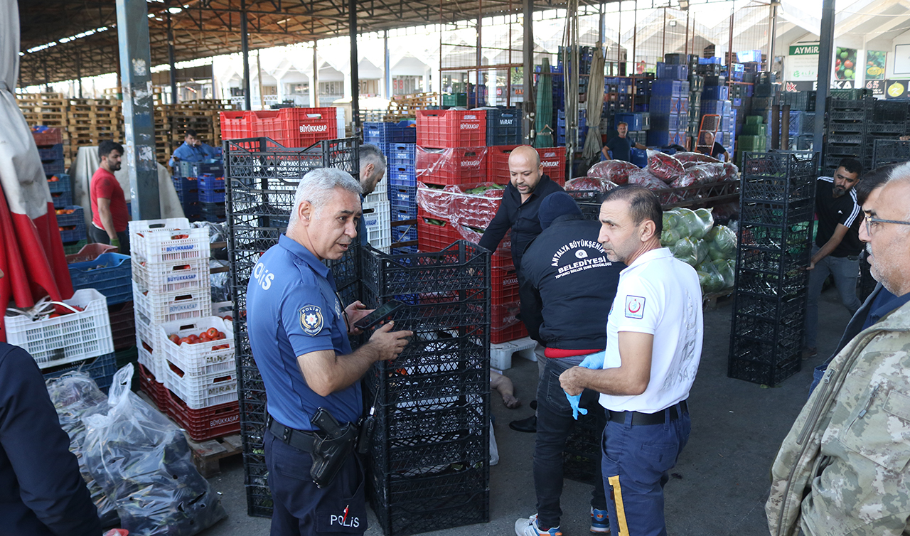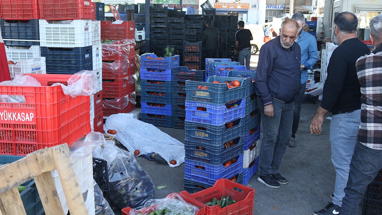 Antalya Toptancı Hali'nde alışveriş yapmak isteyen Mehmet Çolakoğlu (73), bir anda yere yığılıp, hayatını kaybetti. Çolakoğlu'nun cansız bedeninin olduğu alanın etrafı domates kasalarıyla kapatıldı.