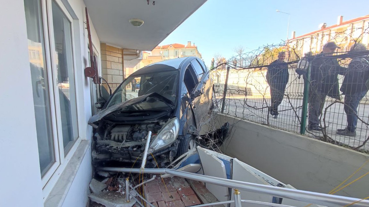Karasu ilçesi Lozan Caddesi'nde seyreden S.E. idaresindeki 34 JA 2221 plakalı otomobil kontrolden çıktı. Demir korkulukları devirerek alt yola düşen otomobil, hızını kesemeyince 20 metre ileride bulunan 4 katlı binanın zemin katının balkonuna girdi.