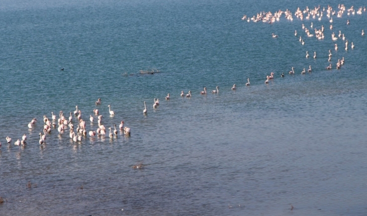 Sabahın erken saatlerinde gelen ilk flamingo sürüsü, İvriz Baraj Gölüne gelerek gölde görsel şölen oluşturdu.