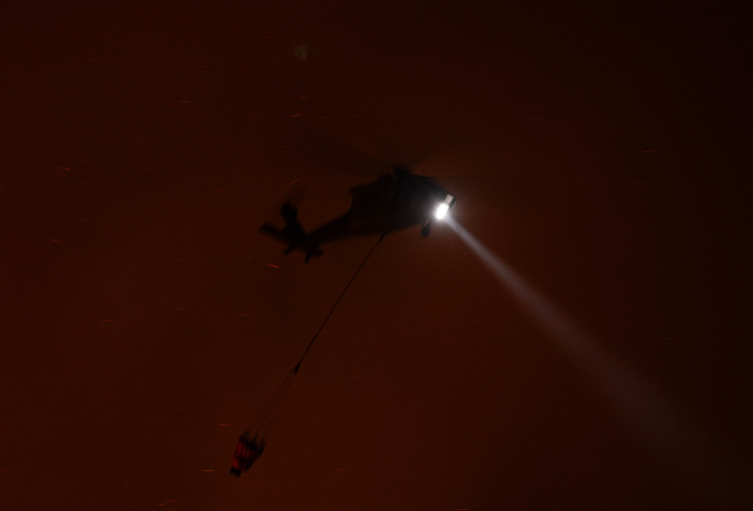 İzmir'in Buca ilçesi Mustafa Kemal Mahallesi'nde dün başlayan ve gece boyunca karadan müdahale edilen yangına, günün ilk ışıklarıyla havadan müdahale yeniden başladı.