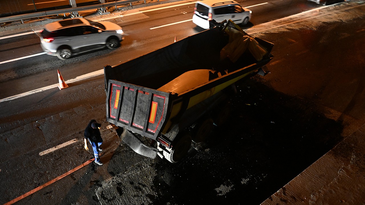 Eyüpsultan-Kemerburgaz Yolu Hasdal Kışlası mevkisinde seyreden 34 BCV 673 plakalı kamyonun dorsesi sebebi bilinmeyen nedenle açılarak üst geçide çarptı.