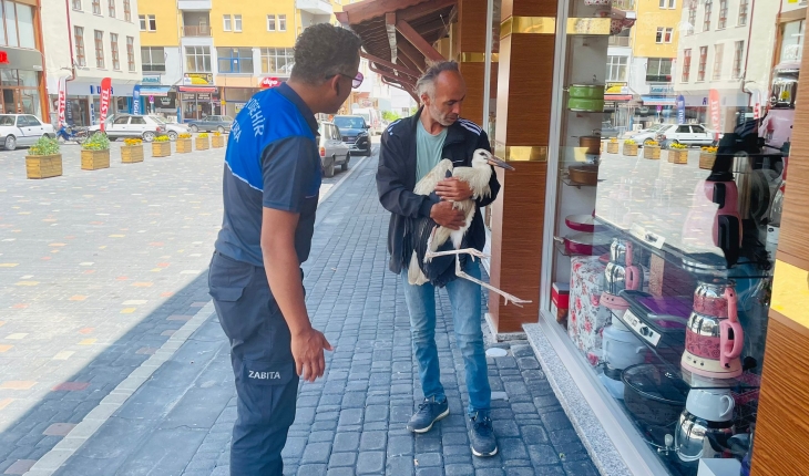 Zabıta ekiplerince alınan yaralı leylek, veterinere götürüldü.