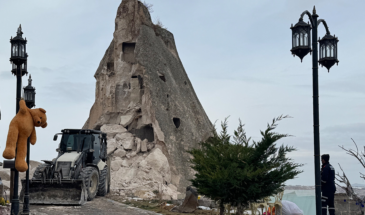 Nevşehir'in Uçhisar beldesi Tekeli Mahallesi'ndeki bir peribacasında gece saatlerinde çökme yaşandı. Geçen hafta etkili olan yağışta karla kaplanan ve tüf kayadan oluşan peribacasının bir bölümü karların erimeye başlamasıyla çöktü.