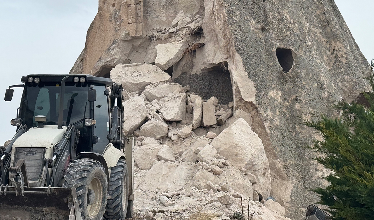 Uçhisar Belediyesi ekipleri, kopan kaya parçalarını iş makinesi yardımıyla kaldırarak alanda temizlik çalışması yaptı.