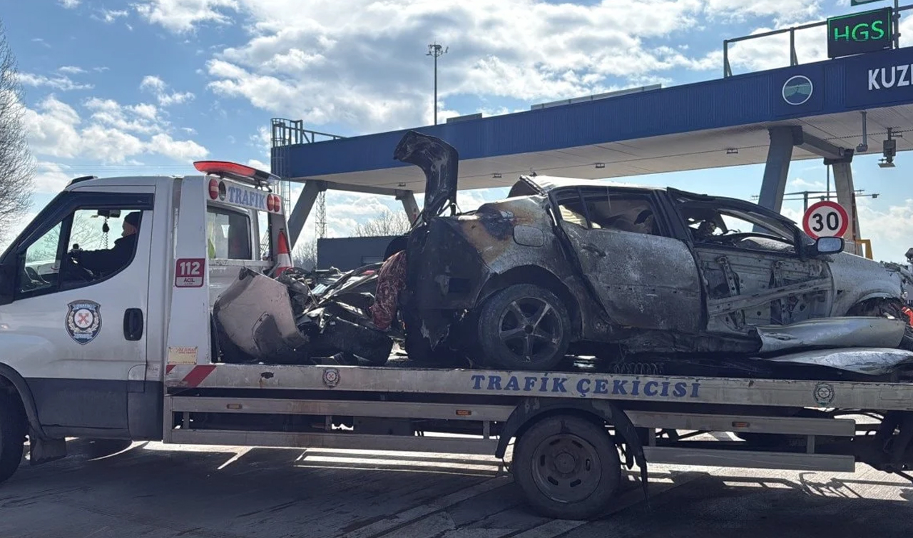 Kuzey Marmara Otoyolu Sakarya geçişinde kontrolden çıkan otomobili, bariyerlere çarparak gişelere ok gibi saplandı. Alev alan otomobilde sürücü yaşamını yitirdi.