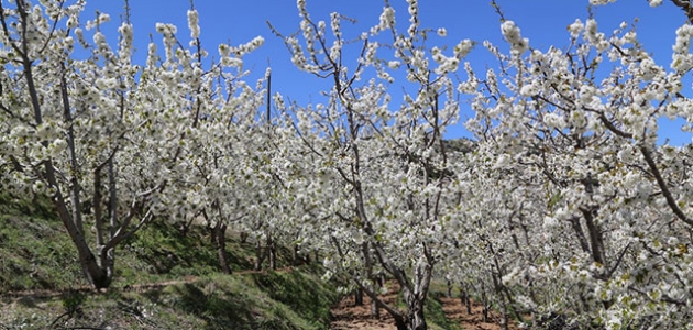 Toros Dağları eteklerindeki kiraz bahçeleri havaların ısınmaya başlamasıyla birlikte beyaza bürünerek ziyaretçilerine görsel şölen sunuyor.