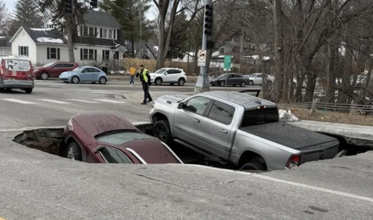 Omaha kentinde kırmızı ışıkta bekleyen iki araç, yolun çökmesiyle oluşan dev çukura düştü; sürücüler sağ salim kurtarıldı.
