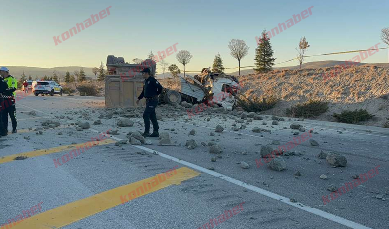 Konya Akyokuş çıkışında hafriyat kamyonunun devrilmesi sonucu meydana gelen kazada sürücü ağır yaralandı.