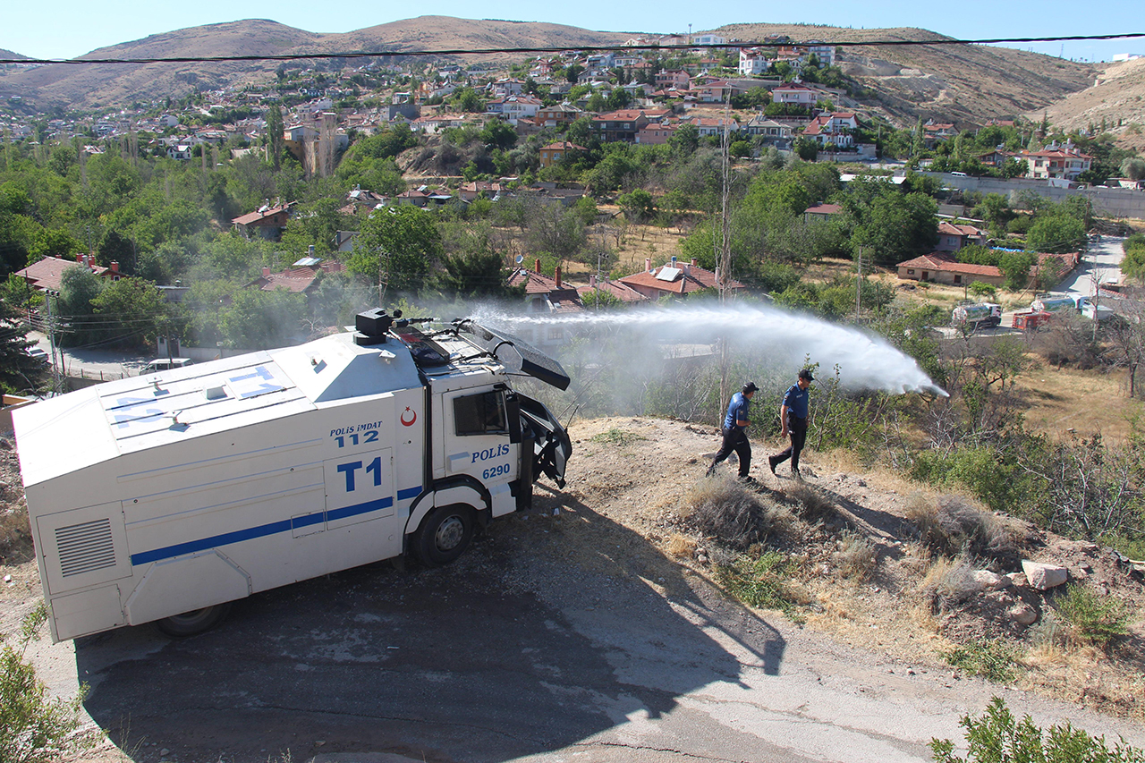 Konya'nın Meram ilçesinde bir evin bahçesinde çıkan yangın rüzgarın etkisiyle ağaçlık alanı sıçramıştı. Olay yerine itfaiye ekipleri sevk edilirken, yangına bir müdahalede Konya Emniyet Müdürlüğü’nden geldi. Çevik Kuvvet Şube Müdürlüğü’ne bağlı TOMA araçları, yangının kontrol altına alınmasına destek verdi.