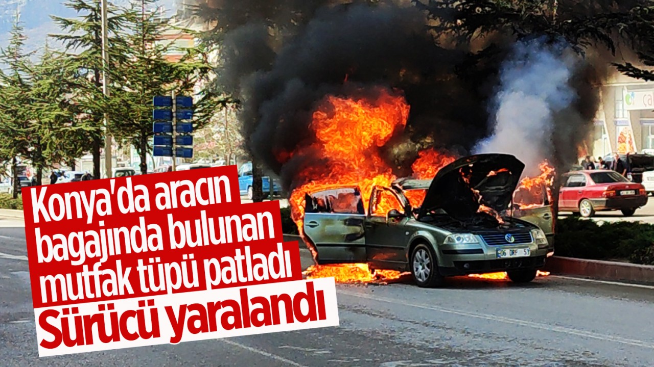 Konya'nın Seydişehir ilçesinde seyir halindeki aracın bagajında bulunan mutfak tüpünün patlaması sonucu araç alev aldı. Aniden yanmaya başlayan otomobil kullanılamaz hale geldi.