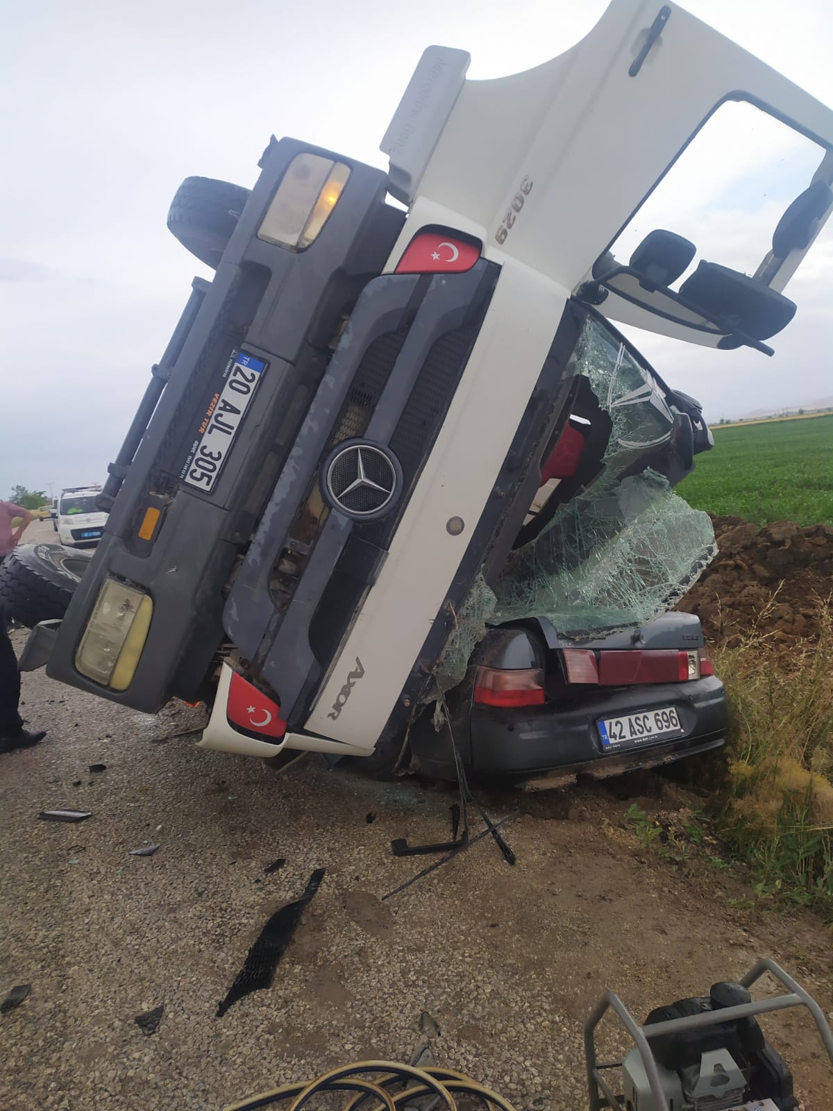 Fethiye Mahallesi'nde 20 AJL 305 plakalı dökme çimento yüklü beton mikseri, Osman Aksoy yönetimindeki 42 ASC 696 plakalı otomobilin üzerine devrildi. İhbar üzerine kaza yerine 112 Acil Servis, polis ve itfaiye ekipleri sevk edildi.