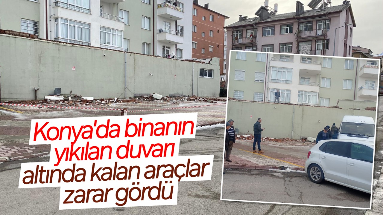 Konya'nın Seydişehir ilçesinde apartmanın yıkılan duvarının altında kalan 2 otomobilde hasar oluştu.