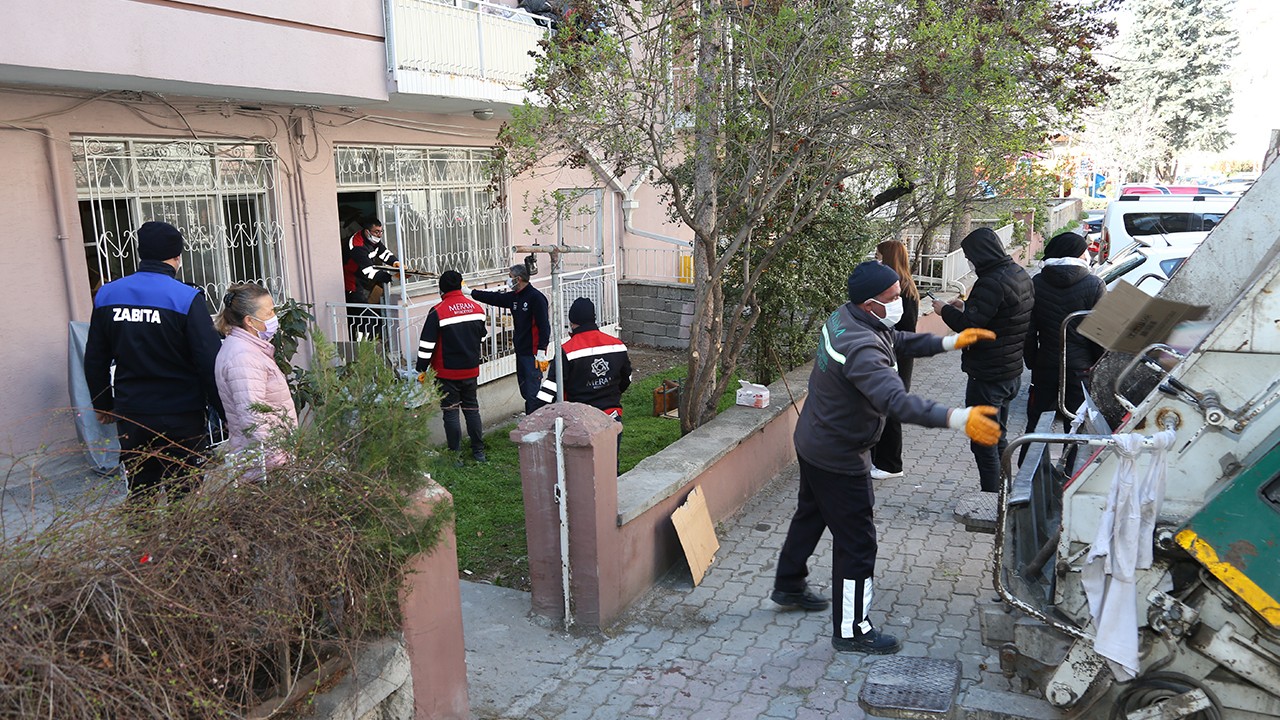 Meram Belediyesi Çevre Koruma ve Kontrol Müdürlüğü ekipleri, evdeki çöpleri kamyonlara doldurarak, dezenfeksiyon işlemi gerçekleştirdi.