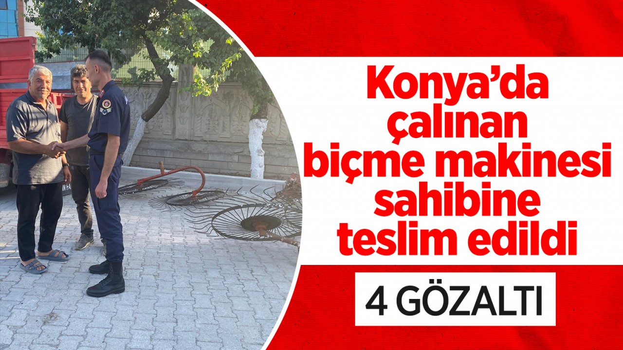 Konya'nın Kulu ilçesinde yonca biçme makinesini çaldığı iddiasıyla 4 şüpheli jandarma ekiplerince yakalanarak gözaltına alındı. Yonca makinası ise sahibine teslim edildi.