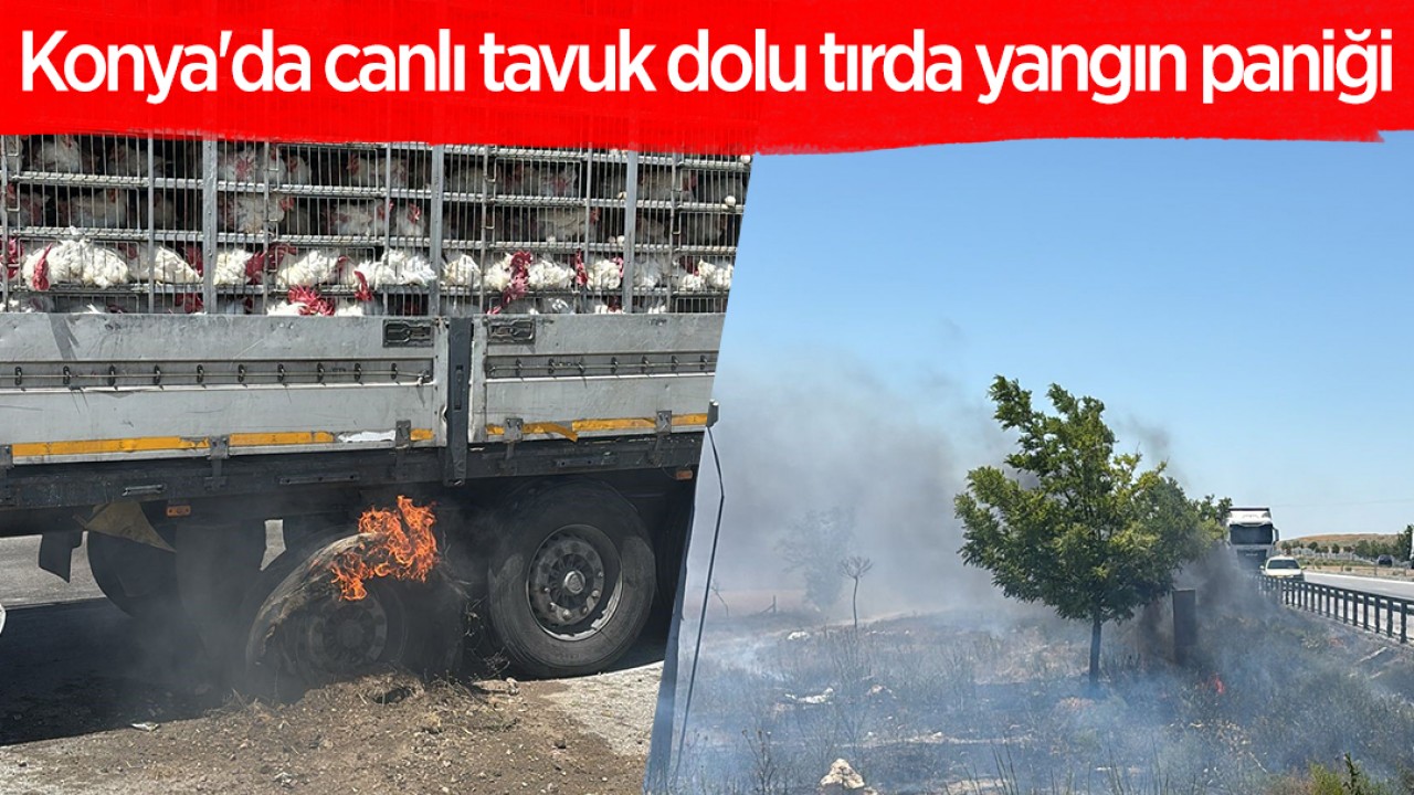 Konya'nın Karapınar ilçesinde canlı tavuk dolu tırın dorse lastiklerinde çıkan yangın paniğe neden oldu.