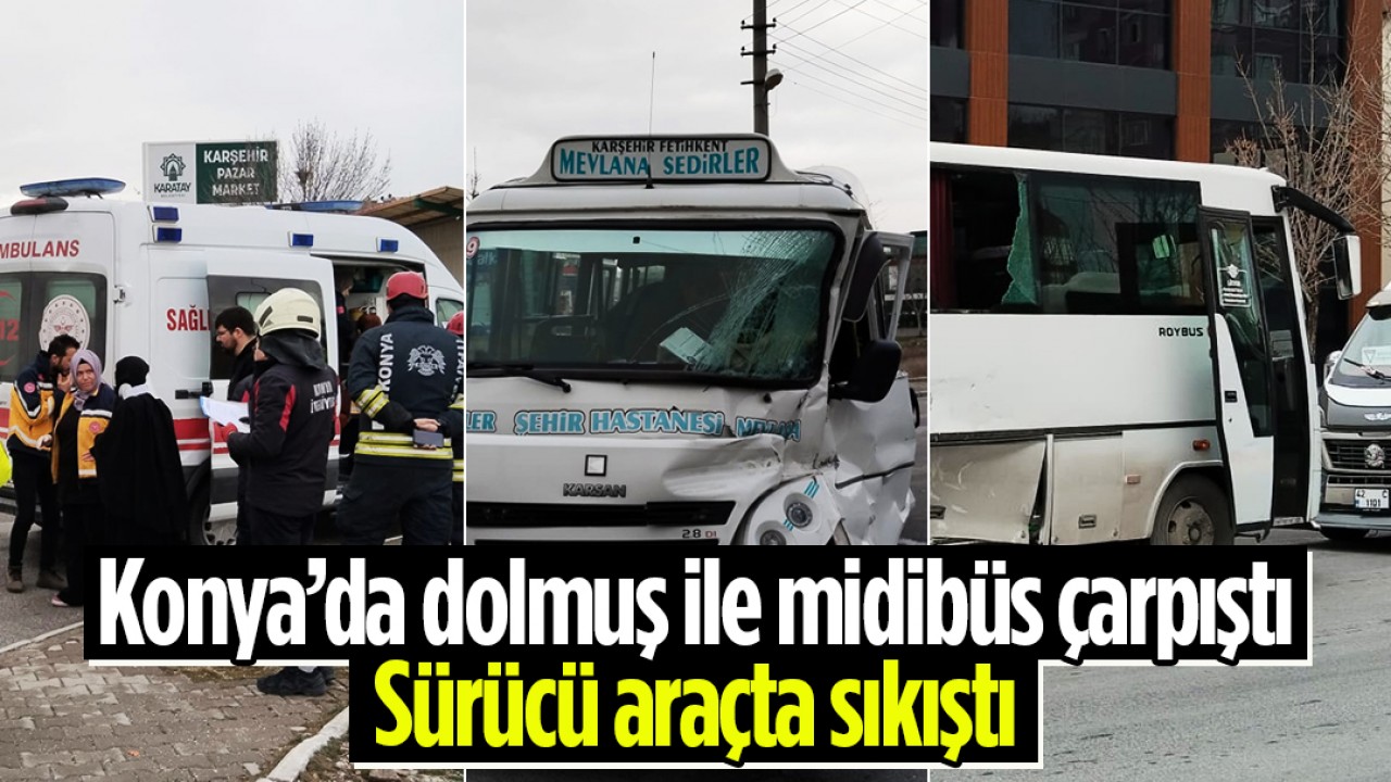 Konya’da dolmuş ile midibüs çarpışması sonucu meydana gelen kazada, dolmuş içinde sıkışan sürücü itfaiye ekiplerince bulunduğu yerden çıkarıldı.