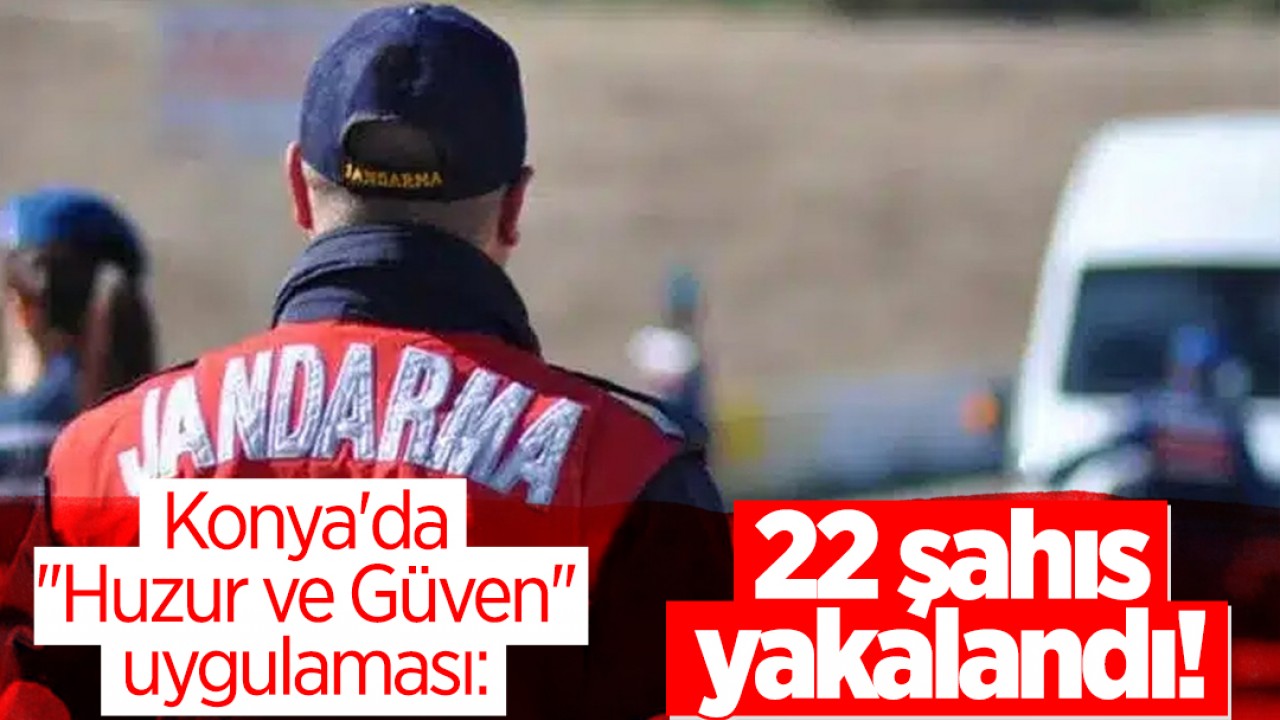 Konya'da İl Jandarma Komutanlığı ekipleri tarafından geniş kapsamlı yapılan “Huzur ve Güven” uygulamasında çeşitli suçlardan aranan 22 şahıs yakalandı.