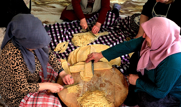 Ramazan ayında iftar ve sahurda tükettikleri ve besleyici ve tok tutma özelliği taşıyan erişteyi yıllardır yapan Rabia Can, “Erişte kesiyoruz, bir gün birimize bir gün birimize erişte keseriz. Yufka yapacağımız sabah ezanla kalkarız. Hamurunu yoğururuz.