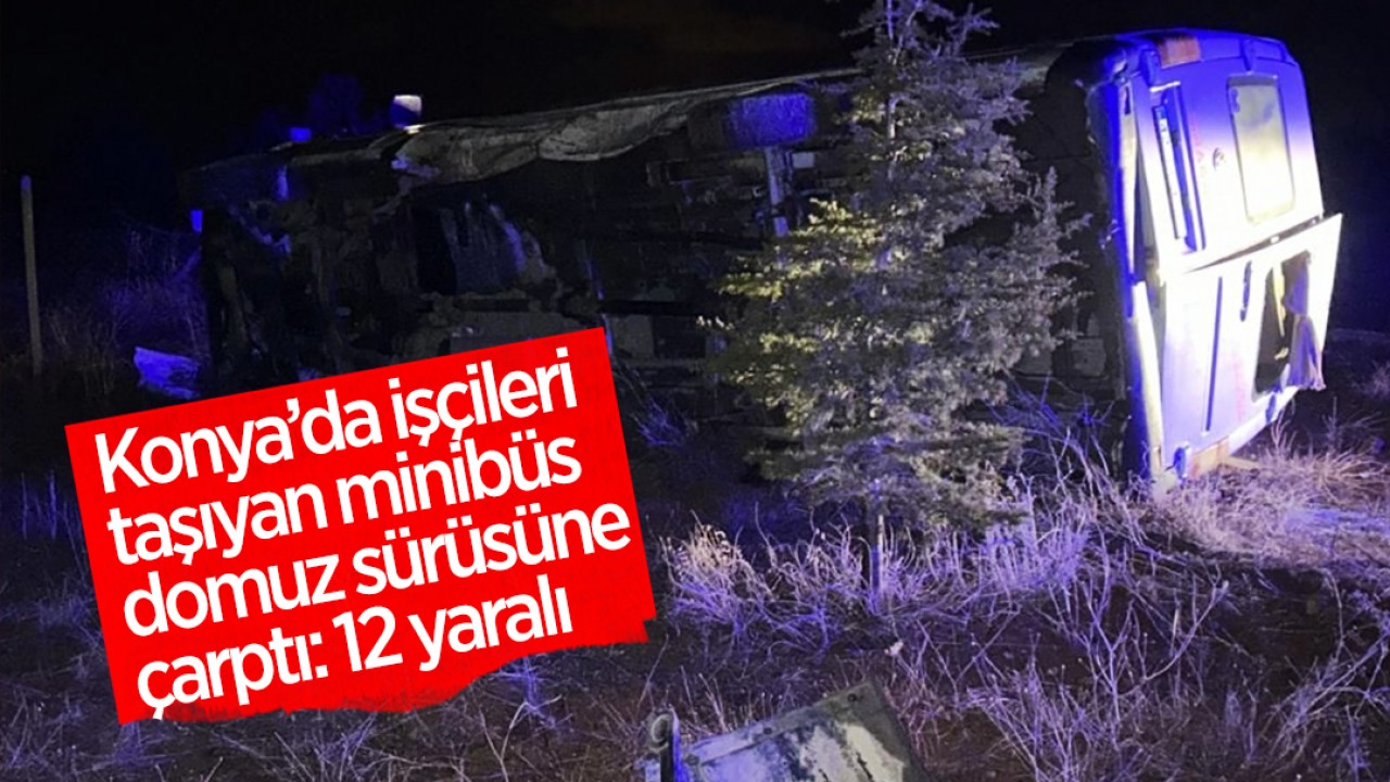 Konya’nın Kadınhanı ilçesinde işçileri taşıyan minibüsün domuz sürüsüne çarpması sonucu meydana gelen kazada 2’si ağır 12 kişi yaralandı.